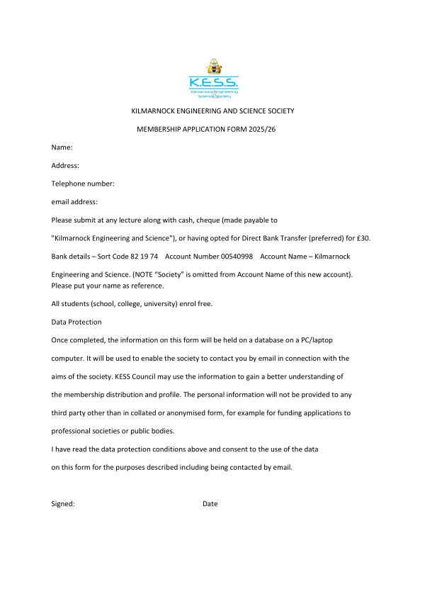"Kilmarnock Engineering and Science"),or having opted for Direct Bank Transfer (preferred) for £30.